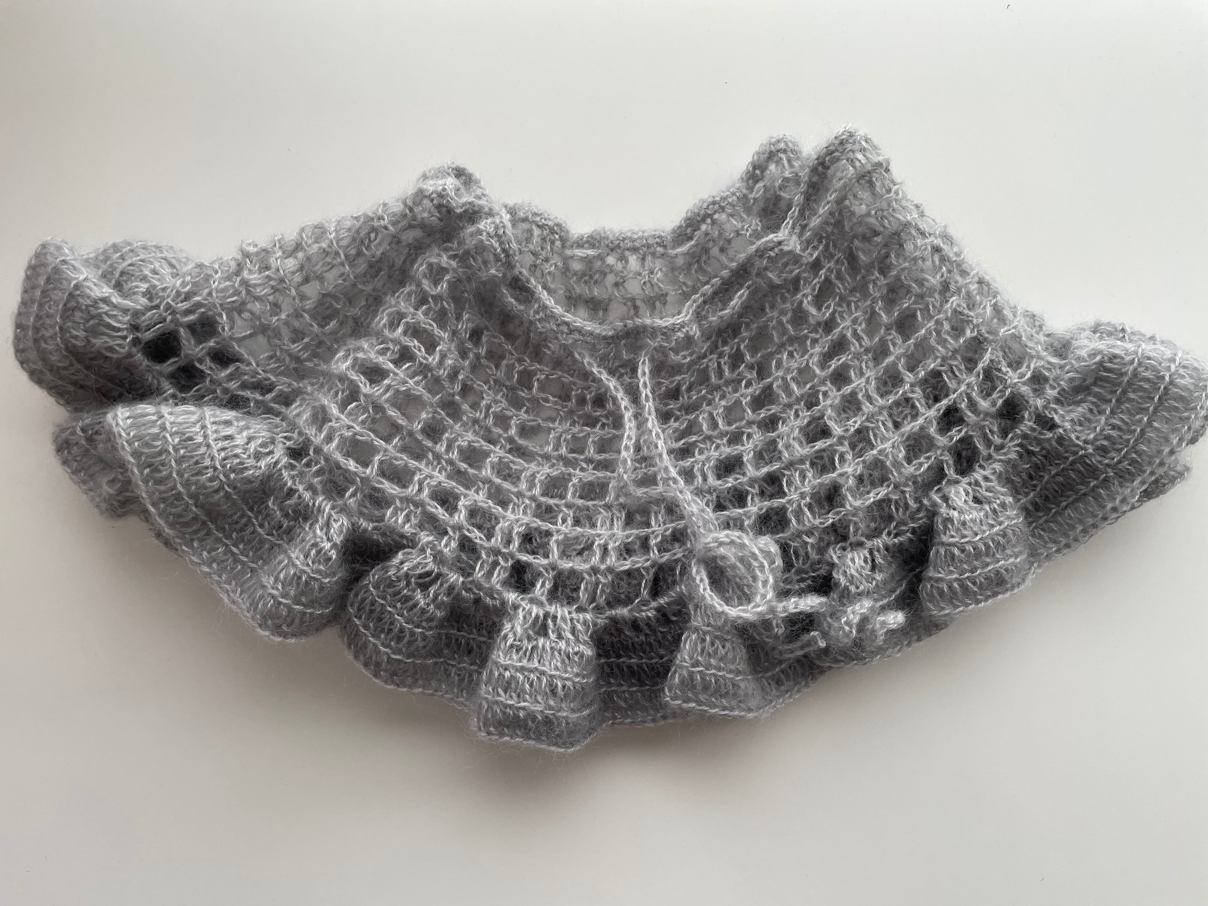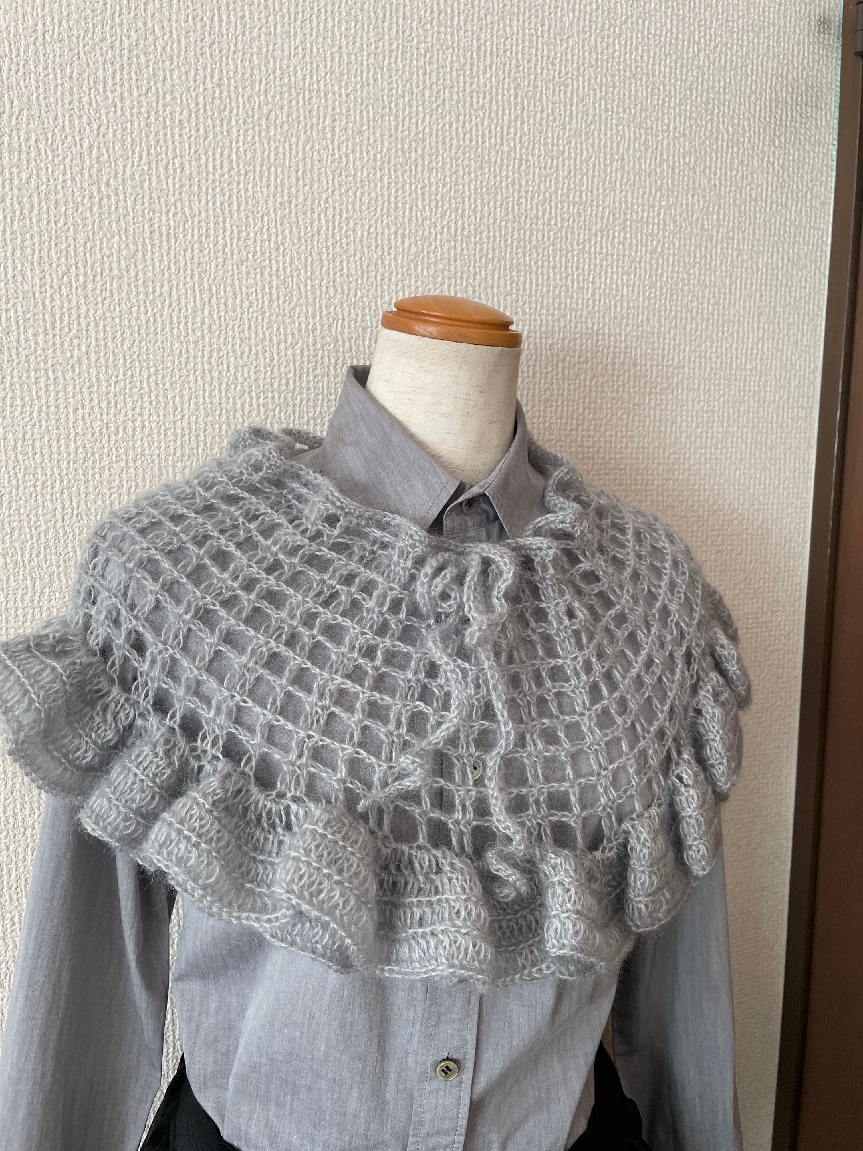 春にも使えるモヘアの糸で、方眼編み模様とたっぷりフリルのポンチョを編みました!