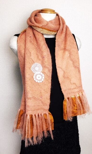 他にはない「レイレイ」独特の色づかいとモチーフの配置が和の雰囲気にマッチして素敵なマフラーに仕上がりました。
